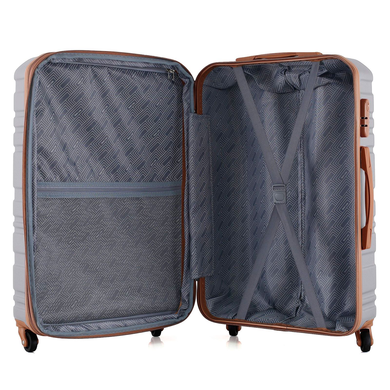 Корпус имеет рифленое покрытие, которое скрывает мелкие царапины, а кодовый замок защищает содержимое чемодана. Чемодан оснащен четырьмя полноповоротными колесами на 360°, обеспечивающими маневренность и устойчивость, а также телескопической ручкой, которая фиксируется в трех положениях. Внутреннее пространство разделено текстильной перегородкой с карманом на молнии, есть эластичные компрессионные ремни для фиксации одежды. Для удобства транспортировки предусмотрены верхняя ручка с мягкой гелевой подкладкой и боковая ручка.