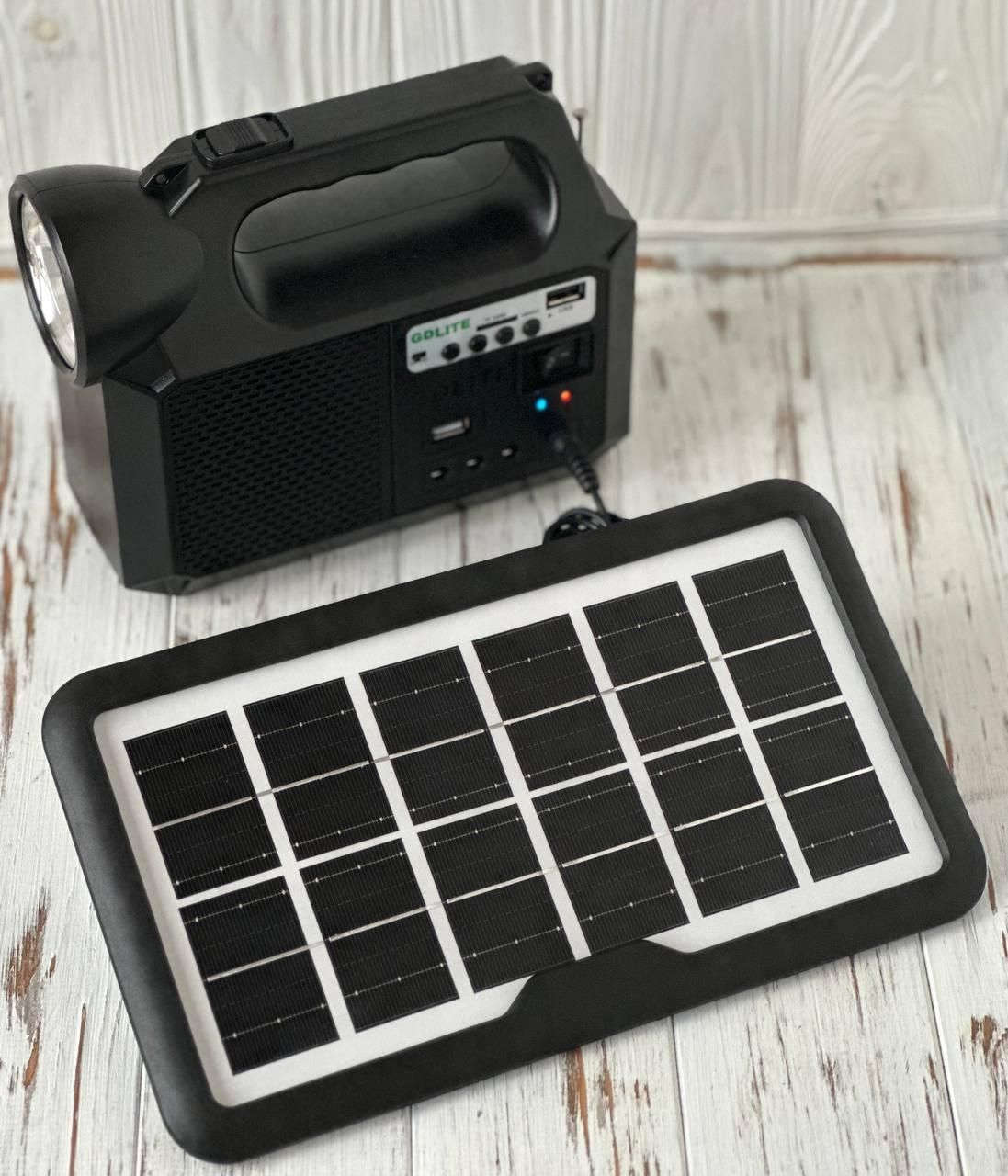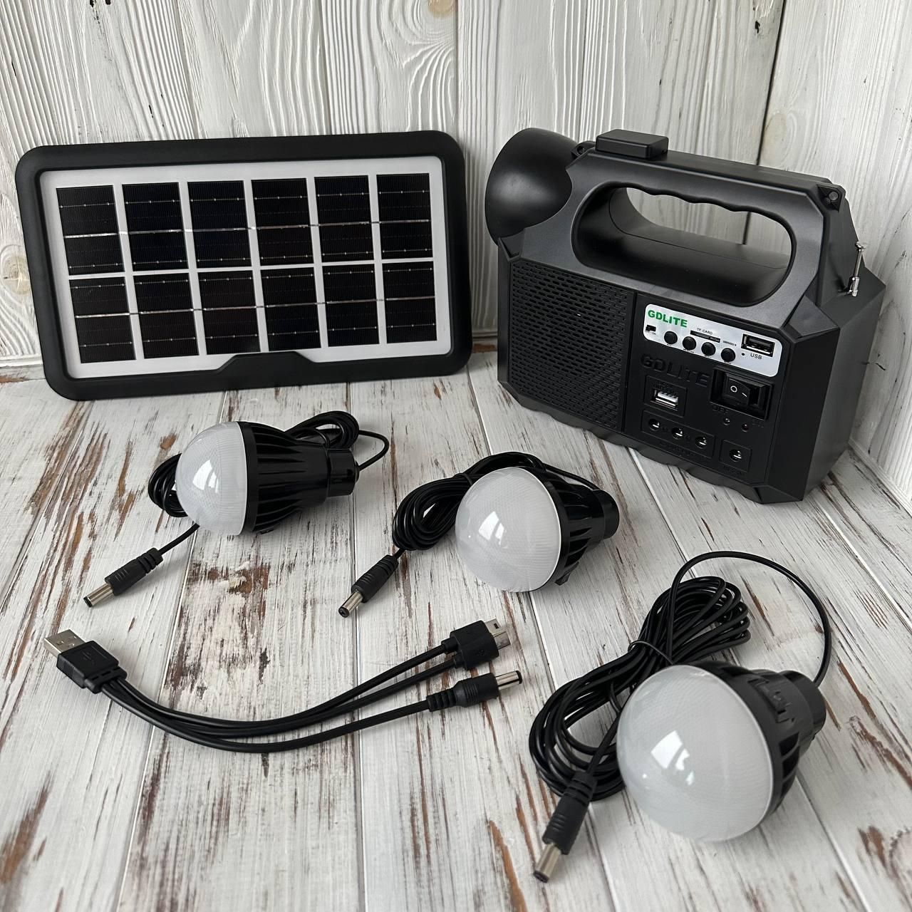 Мощная солнечная станция GDLite GD-1000A. Панель, фонарь, power bank + FM-радио + Лампы + Bluetooth