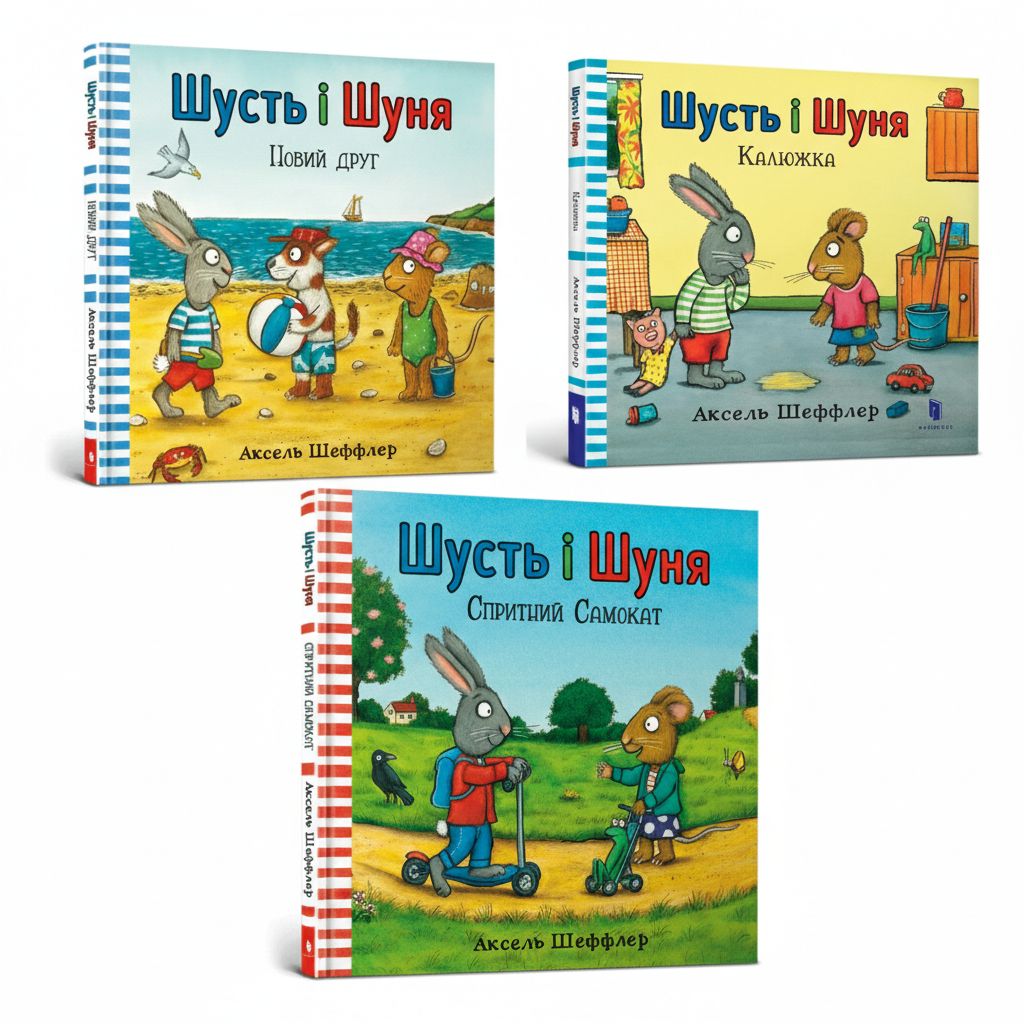 Набор книг «Шуст и Шуня» (3 шт.) — Аксель Шеффлер: Новый друг, Калюжка, Гибкий самокат