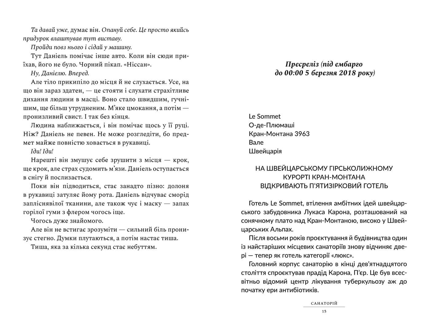 Роскошный отель высоко в Швейцарских Альпах — последнее место, где Элин Уорнер хотела бы оказаться. Когда-то заброшенный санаторий с жуткой историей, теперь это модный курорт для богатых гостей. Элин, следователь в вынужденном отпуске после травмирующего дела, приезжает сюда только ради брата и его помолвки.