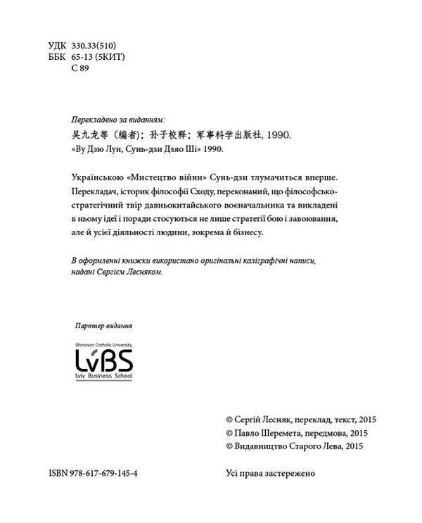 «Искусство войны» Сунь Цзы впервые интерпретируется на украинском языке. Переводчик, историк восточной философии, убежден, что философско-стратегический труд древнекитайского полководца и содержащиеся в нем идеи и советы касаются не только стратегии сражения и завоеваний, но и всей человеческой деятельности, в том числе деловой.