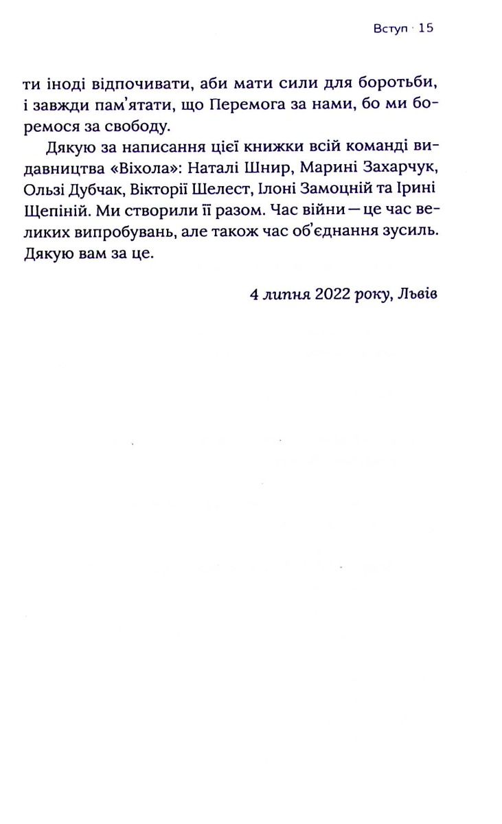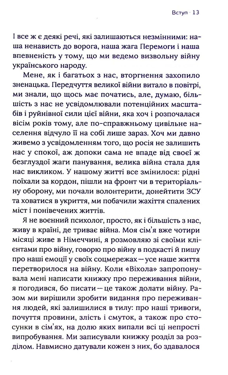 Это книга об опыте мирных жителей в тылу: тех, кто остался, и тех, кто ушел; те, кто волонтерит, ждут родственников с фронта или начинают утро с ленты новостей. Не мы выбирали это время, но наша задача — научиться в нем жить, сохраняя себя для будущей победы.