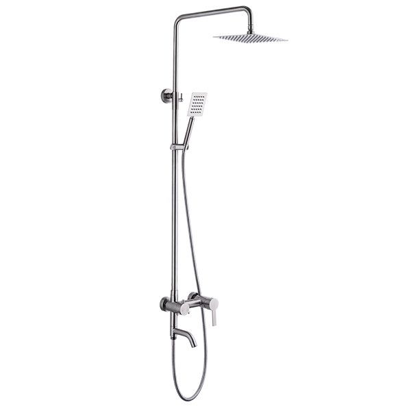 Душевая колонна со смесителем из нержавеющей стали с квадратными лейками устанавливаемая на стену, в в в комплекте верхний тропический душ, шланг и душевая лейка. Вся комплектация выполнена из нержавеющей стали.