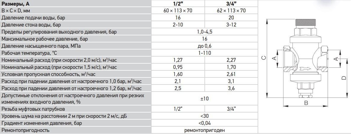 Давление на выходе регулятора воды поддерживается на уровне не выше настроенного значения независимо от скачков давления в сети. В статическом режиме давление после редуктора также не превышает настроенное. При производстве редуктора давления используется никелированная латунь.