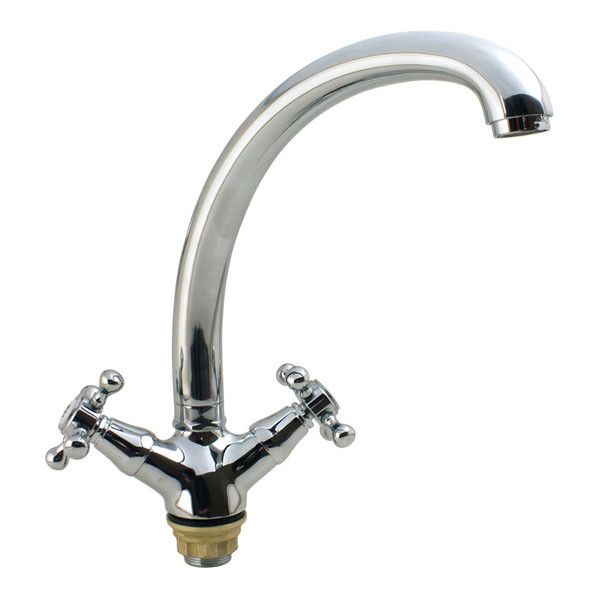 Латунный вентильный (кран-буксовый) смеситель с поворотным высоким носом, комплектуется гибкой подводкой 45 см. Смеситель предназначен для монтажа на одно отверстие, крепится к мойке поджимной гайкой.