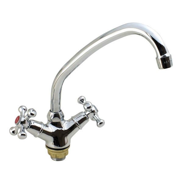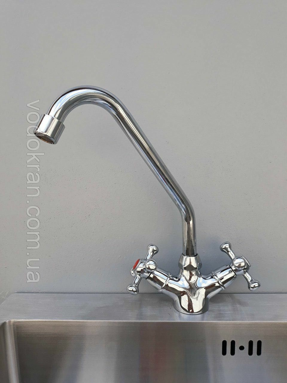 Латунный вентильный (кран-буксовый) смеситель с поворотным высоким носом, комплектуется гибкой подводкой 45 см. Смеситель предназначен для монтажа на одно отверстие, крепится к мойке поджимной гайкой.