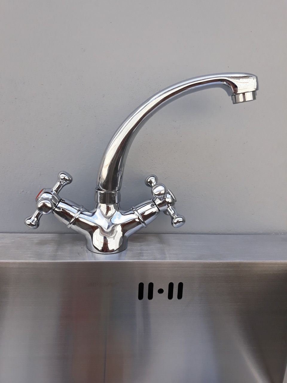 Латунный вентильный (кран-буксовый) смеситель с поворотным высоким носом, комплектуется гибкой подводкой 45 см. Смеситель предназначен для монтажа на одно отверстие, крепится к мойке поджимной гайкой.
