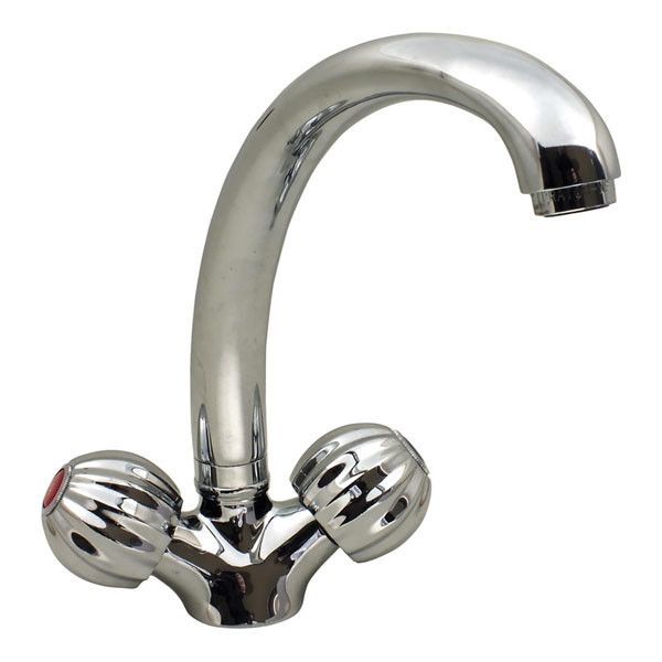 Латунный вентильный (кран-буксовый) смеситель с поворотным высоким носом, комплектуется гибкой подводкой 45 см. Смеситель предназначен для монтажа на одно отверстие, крепится к мойке двумя шпильками