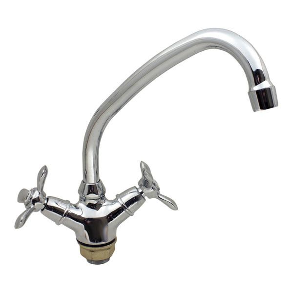 Латунный вентильный (кран-буксовый) смеситель с поворотным высоким носом, комплектуется гибкой подводкой 45 см. Смеситель предназначен для монтажа на одно отверстие, крепится к мойке поджимной гайкой.