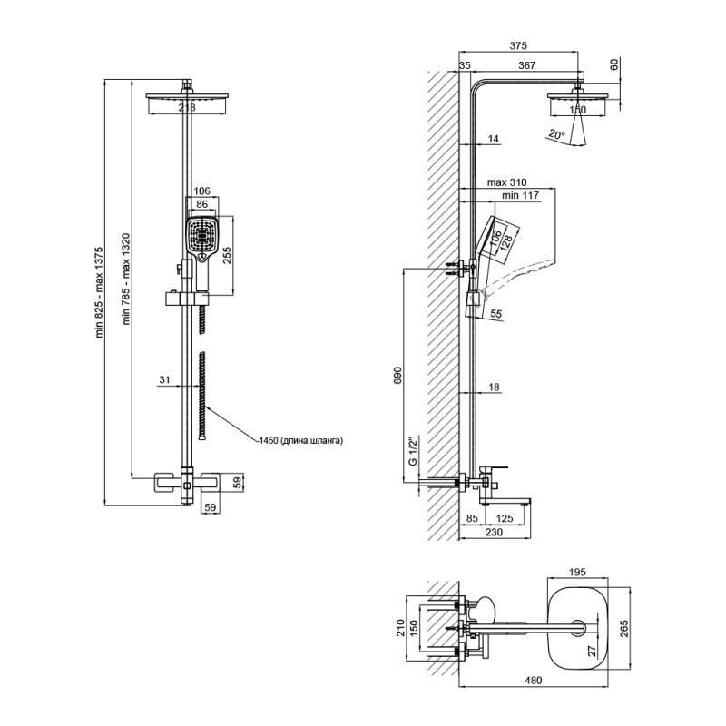 Высота душевой стойки, мм785-1320