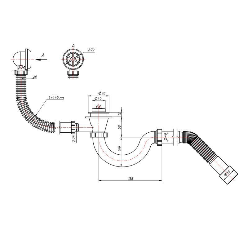 Дополнительные характеристикиДлина перелива: 445 мм. Длина гофрированной трубы: 235 - 425 мм.