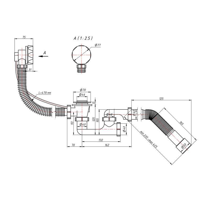 Дополнительные характеристикиДлина перелива: 470 мм. Длина троса: 560 мм. Длина гофрированной трубы: 235 - 425 мм.