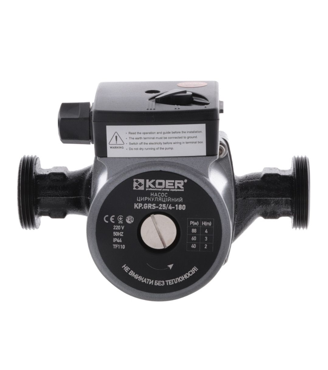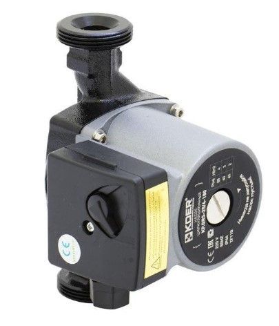 Циркуляционный насос с мокрым ротором Koer и резьбовым соединением. Имеет три предварительно задаваемые ступени частоты вращения для регулирования мощности. Обмотка медная , вал -керамика.