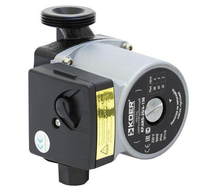 Циркуляционный насос с мокрым ротором Koer и резьбовым соединением. Имеет три предварительно задаваемые ступени частоты вращения для регулирования мощности. Обмотка медная , вал -керамика.