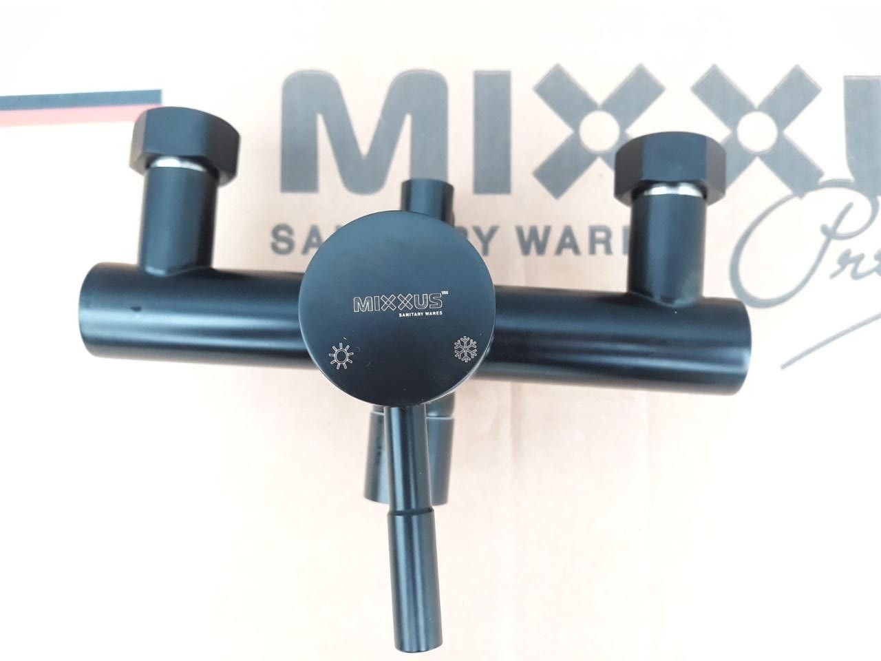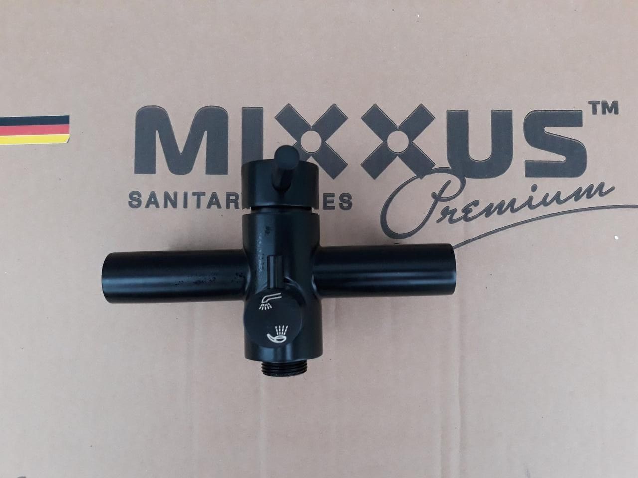 MIXXUS SUS-006 Black сделан в классическом дизайне. Поворотный гусак 300 мм имеет прямую форму. В корпусе прибора вмонтирован евро переключатель на душевую лейку, идущую в комплекте с гофрированным шлангом. Установка прибора осуществляется настенным способом к водопроводным трубам горячей и холодной воды. Функции смешивания выполняет керамический картридж 35 мм.