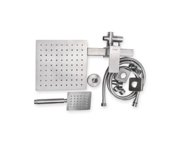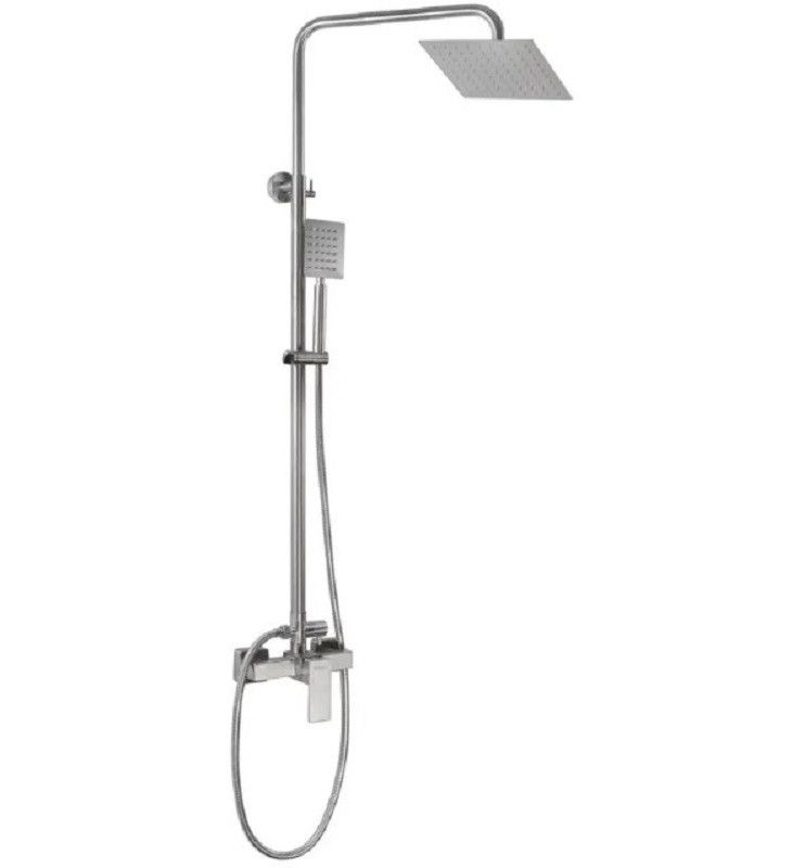 Душевая система со смесителем Kub 003-J выполнена полностью из нержавейки, шланг 150 см, лейка верхняя 20 см*20 см и ручная лейка так же выполнены из нержавейки.