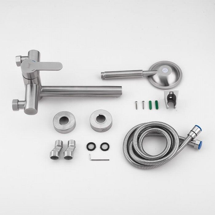 Смеситель для ванной с удлиненным изливом Frap F32801 выполнен из пищевой нержавеющей стали марки SUS304. Конструкция простая, но функциональная. Все регулировки точные, плавные и расположены удобно. Материал изготовления нержавеющая сталь. В комплекте идут шланг, лейка и эксцентрики. Лейка работает в одном режиме, а длина шланга 1.5 метра. Подключается к большинству выходу труб.