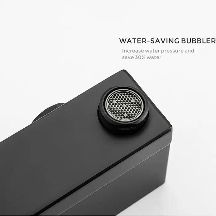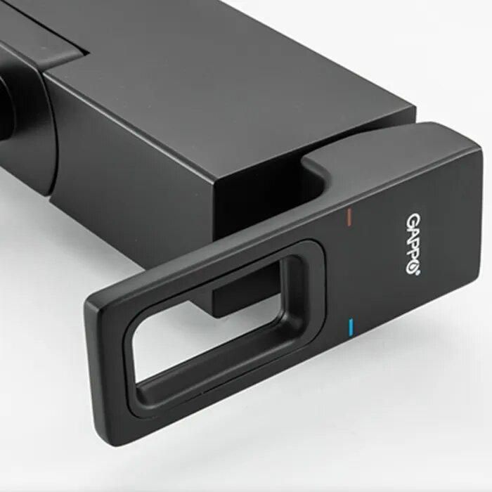 Смеситель для ванной Gappo G3217-6 выполнен из латуни и окрашен в черный цвет порошковой краской. Такой тип покраски не облазит от воздействия воды. Латунь не ржавеет и не окисляется. Внутри смесителя установлен испанский керамический картридж.