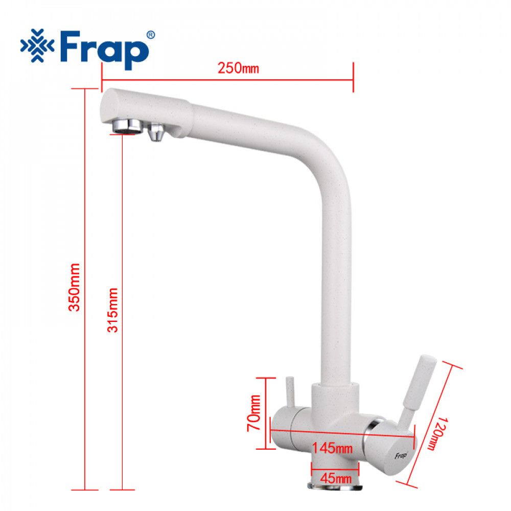 Смеситель для кухни Frap F4352-8 предназначен для подключения к фильтру питьевой воды. Смеситель обладает в конструкции дополнительным рычагом управления, который позволяет включать отфильтрованную воду отдельно от той, что поступает по водопроводу, питьевая вода и водопроводная не смешиваются друг с другом.