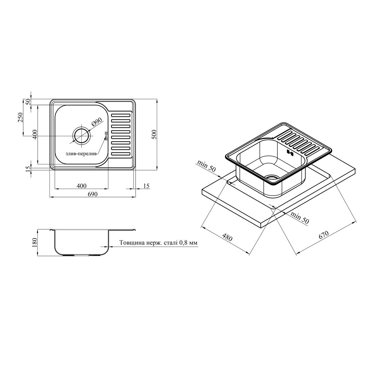 Кухонная мойка Kroner KRP Satin - 6950 (0.8 мм)
