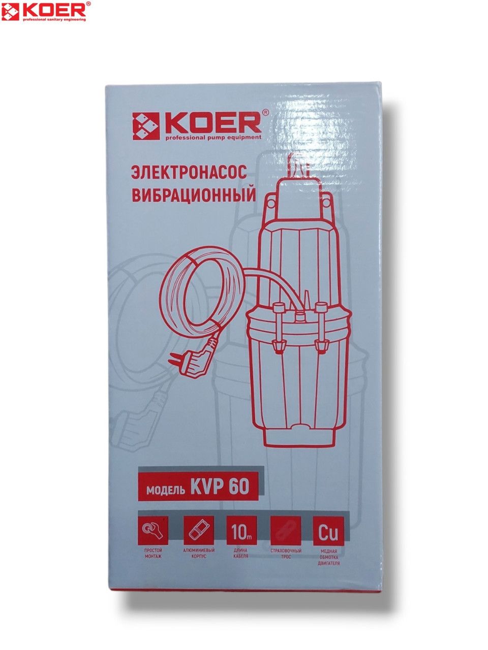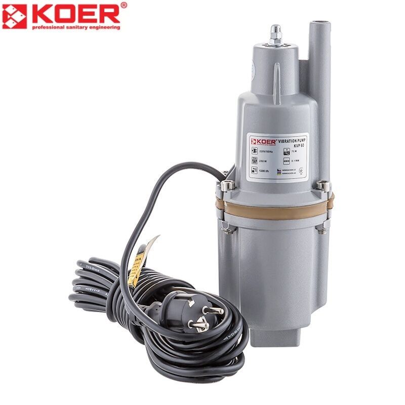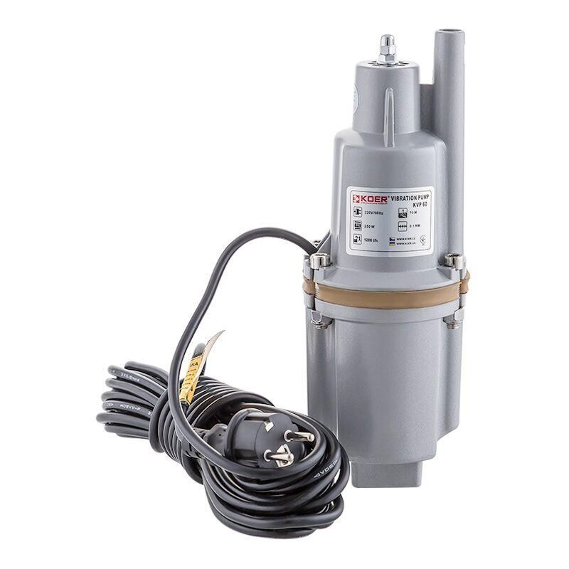 Насос вибрационный с верхним забором воды KOER KVP 60 - это надежное и высокопроизводительное оборудование для подачи воды в частных домах, дачах, фермах и других объектах. Этот вибрационный насос может обеспечить максимальный напор воды до 70 метров. Это может быть полезно для подачи воды на большие расстояния. Корпус выполнен из прочного и легкого алюминия. Обмотка двигателя насоса выполнена из меди, что так же является преимуществом над аналогичными товарами. Длинна кабеля составляет 10 м, страховочный трос идет в комплекте поставки вибрационного насоса. Номинальная пропускная способность насоса KOER KVP 60-1 составляет 720 литров в час, максимальная - 1200 литров воды в час.