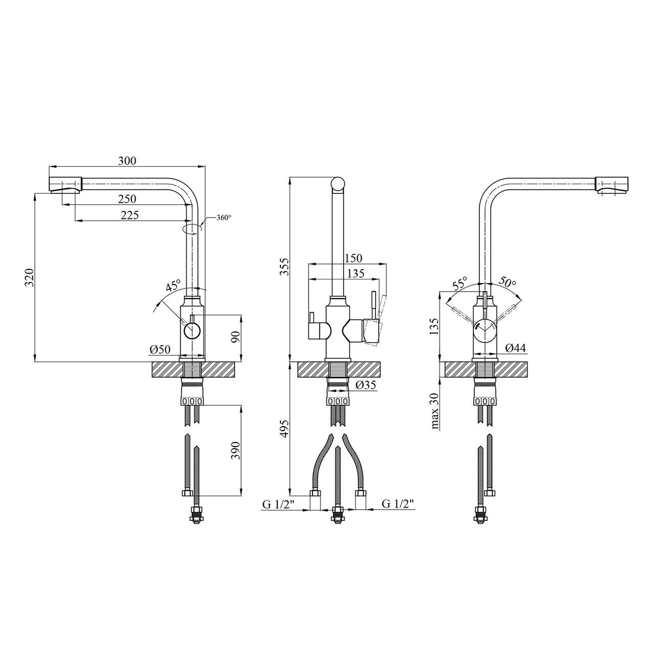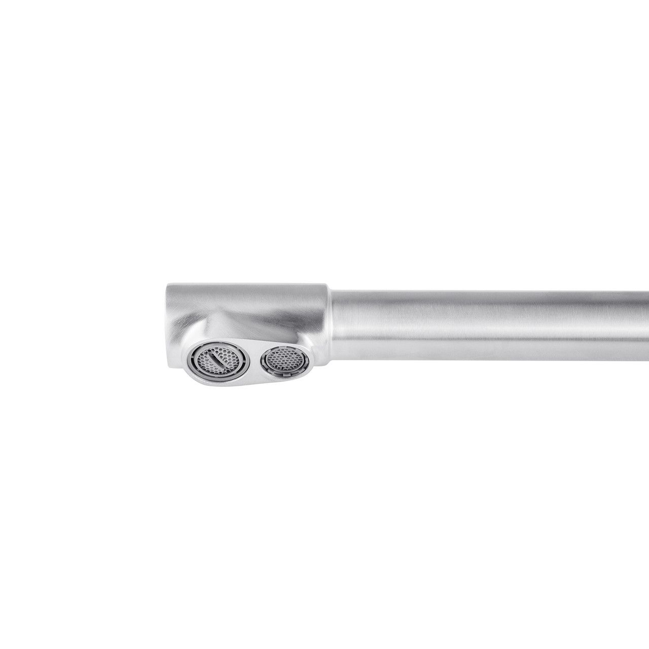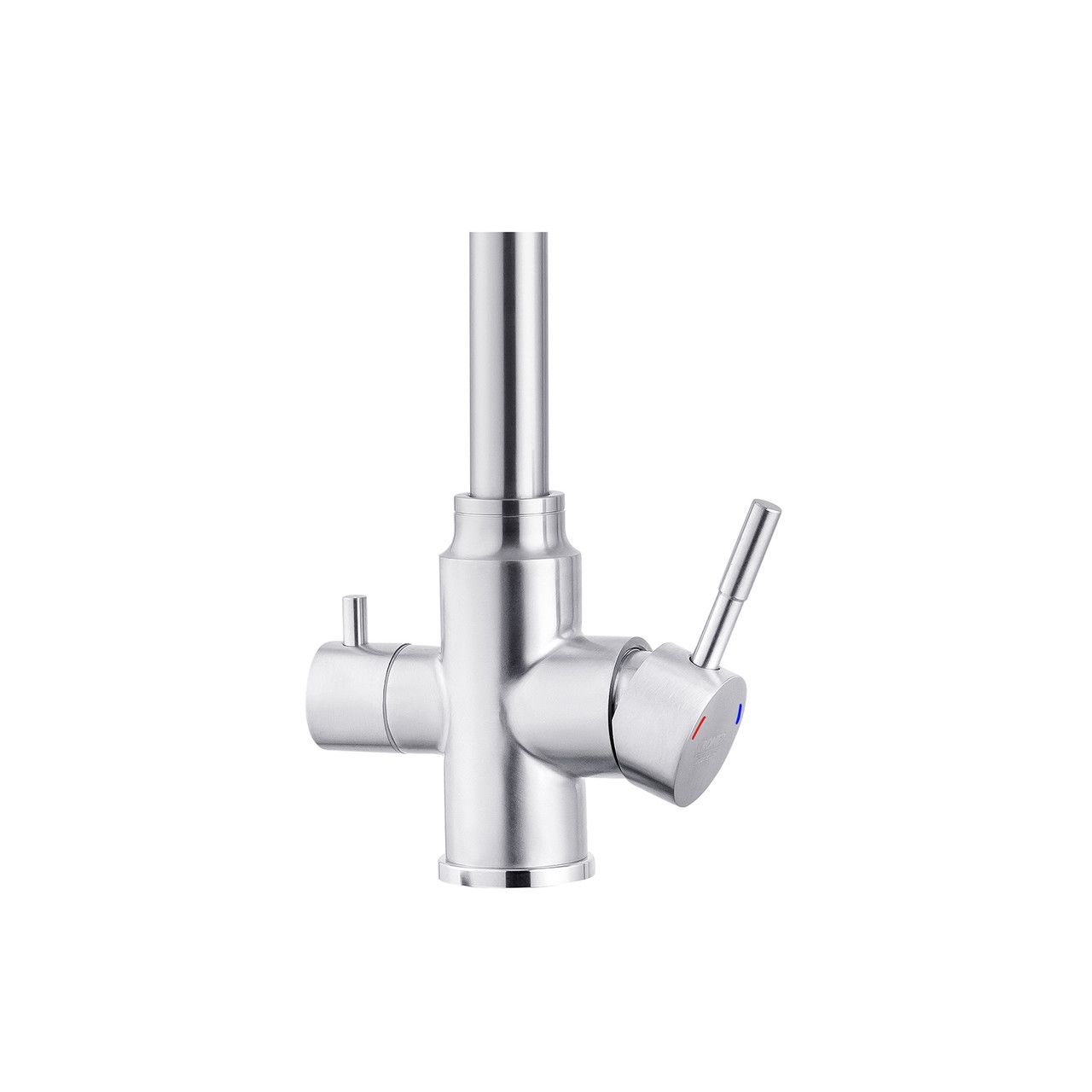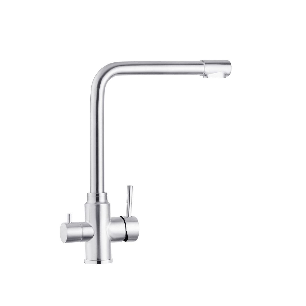 Смеситель для кухни с подключением к фильтру Kroner KRP Edelstahl Klassisch - ESG038 – идеальный выбор для вашей кухни. Изготовлен из нержавеющей стали, гарантирует прочность и долговечность. Обладает привлекательным брашированным никелевым цветом, что придает ему элегантность. Смеситель оснащен картриджным механизмом смешения, позволяющим удобно регулировать температуру воды. Его уникальная Г-образная форма излива обеспечивает удобство при наполнении посуды или мытья продуктов. Наслаждайтесь функциональностью и стилем смесителя Kroner.