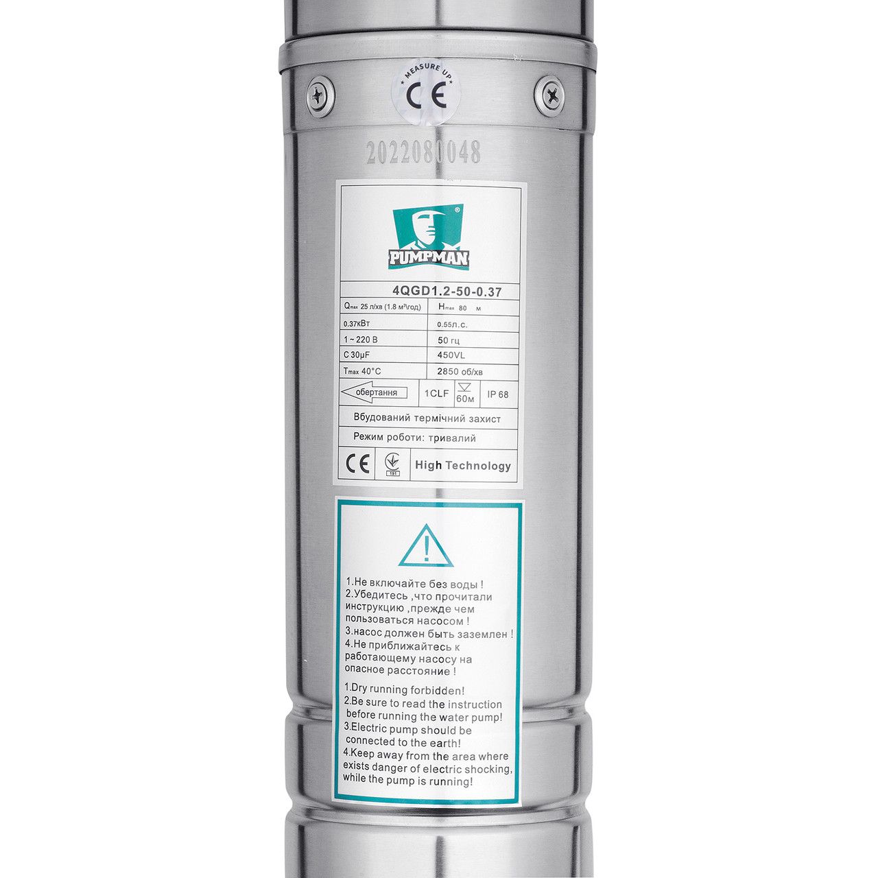 Насос глубинный шнековый Pumpman 4QGD1.2-50-0.37 кВт Нmax 80 м Qmax 1,5 куб.м 370 Вт