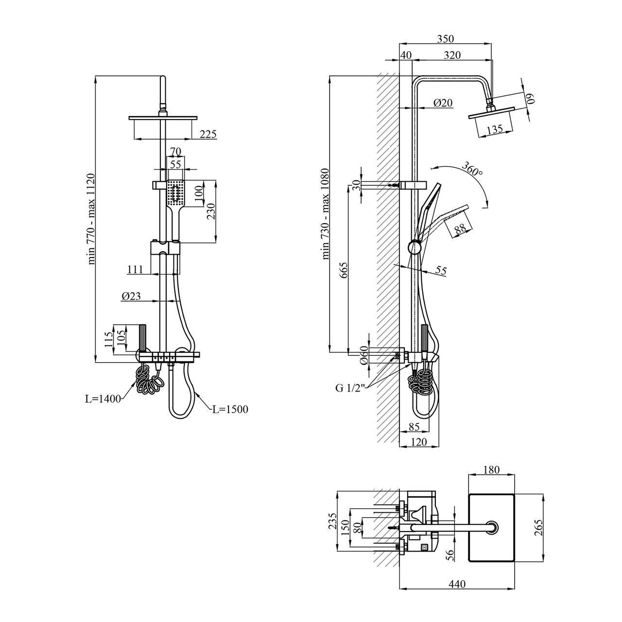 Высота душевой стойки, мм730-1080