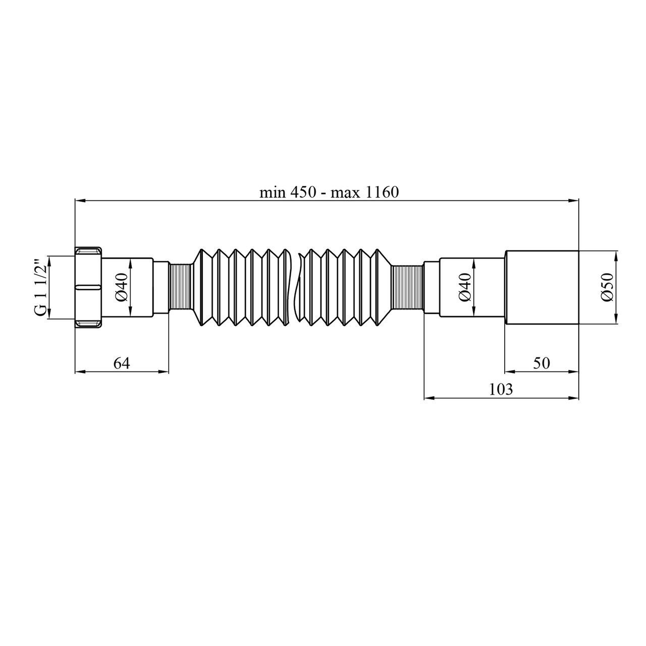Гофротруба Agua GN46 1 1/2''х40/50 мм 460-1100 мм с накидной гайкой для соединения канализации с внутренним диаметром 40 мм с резьбовым выпуском 1 1/2" (40 мм). Комплектуется плоской прокладкой из ПВХ белого цвета. Рабочий диапазон температур от 0 до +95°C.