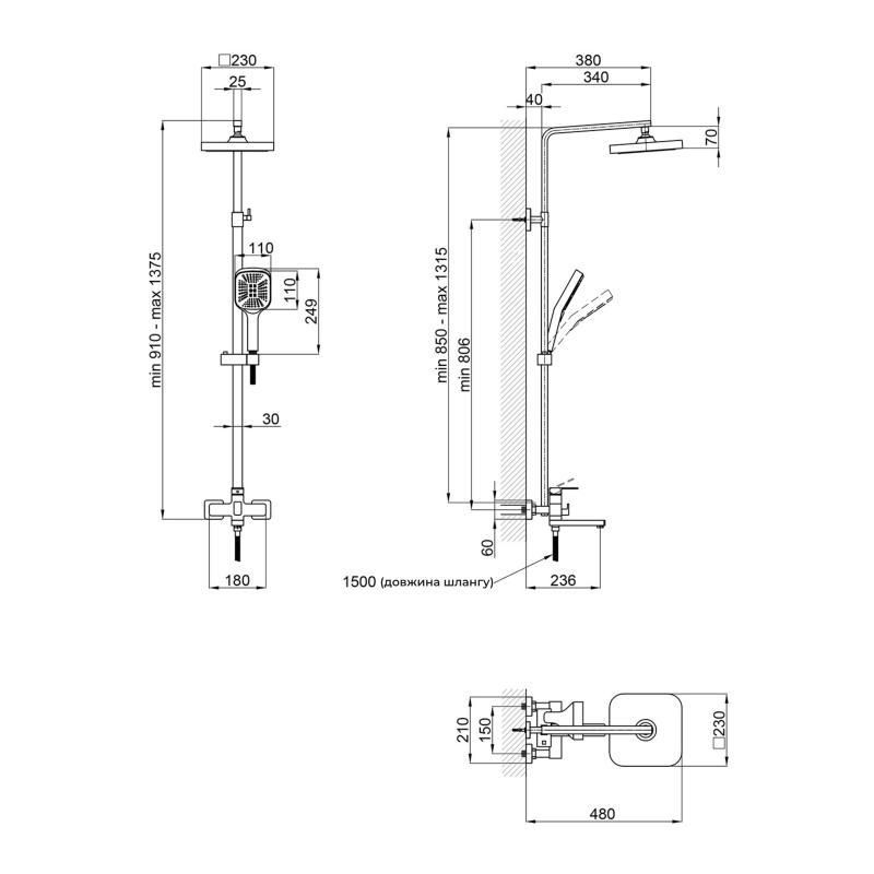 Высота душевой стойки, мм850-1315