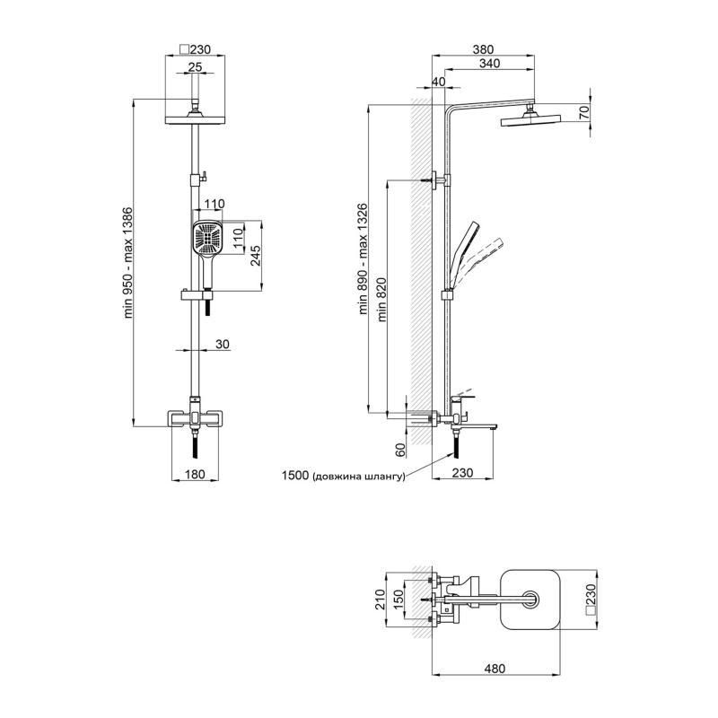 Диаметр лейки, ммРучной душ: 110х110. Верхний душ: 230