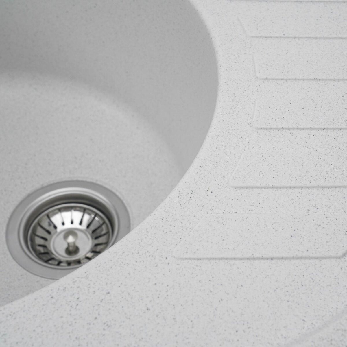Мойка имеет матовую фактуру и приятный для глаза цвет - белый (в черную точку), что позволяет ей легко вписаться в интерьер кухни.