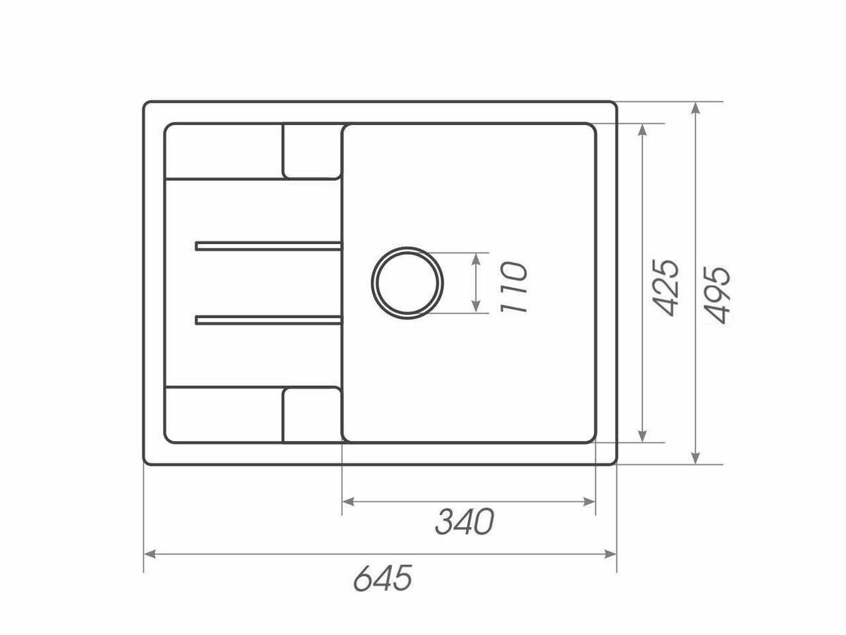 Размеры мойки – 645х495х200 мм, вес – 11 кг, сифон - евросифон с широкой горловиной, 110 мм.