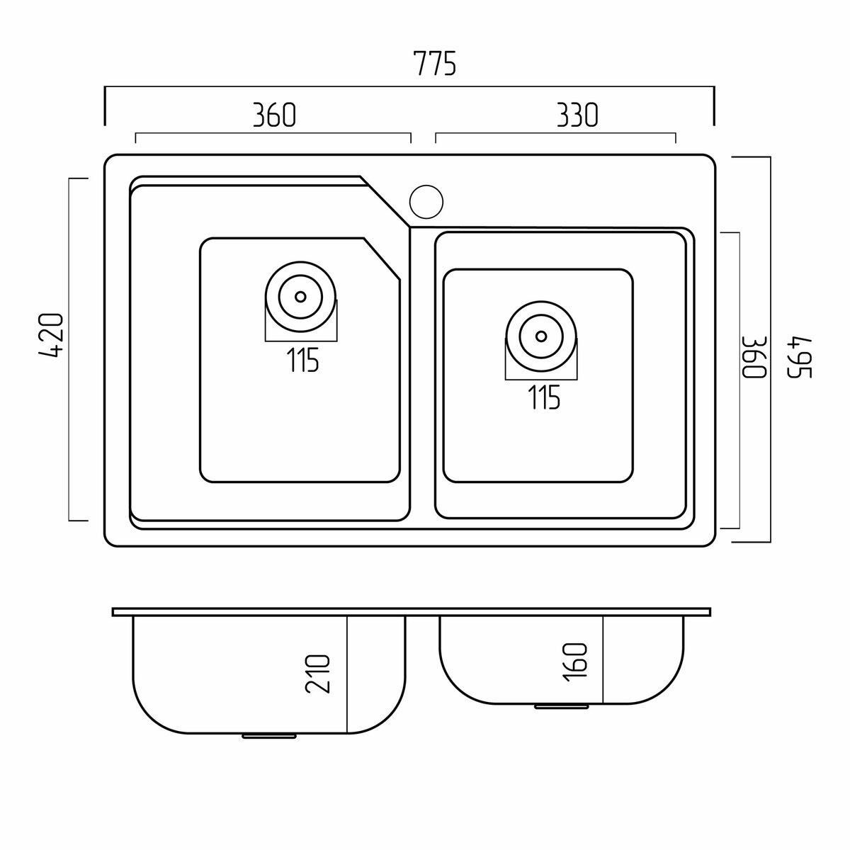 Размеры первой чаши, 355х420х210 мм, делают ее очень вместительной и удобной в использовании. Вторая чаша имеет размеры 355х360х150 мм. Монтаж осуществляется врезным способом в кухонный шкаф шириной не менее 520 мм.