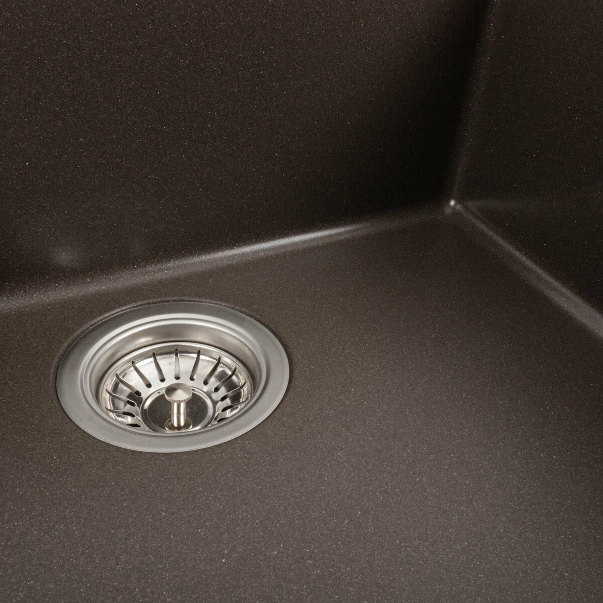 Мойка имеет матовую фактуру и приятный для глаза цвет - темная скала, что позволяет ей легко вписаться в интерьер кухни.
