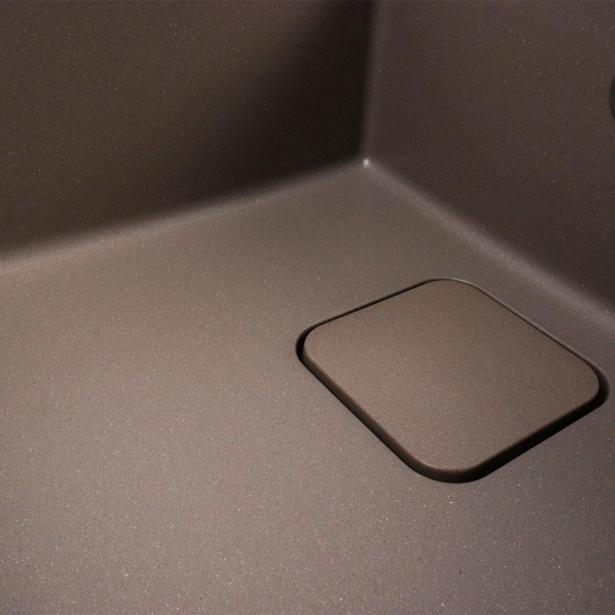 Мойка на 80% состоит из кварца и на 20% из очень жесткой акриловой смолы, благодаря чему неприхотлива в уходе, а также имеет большой запас прочности.