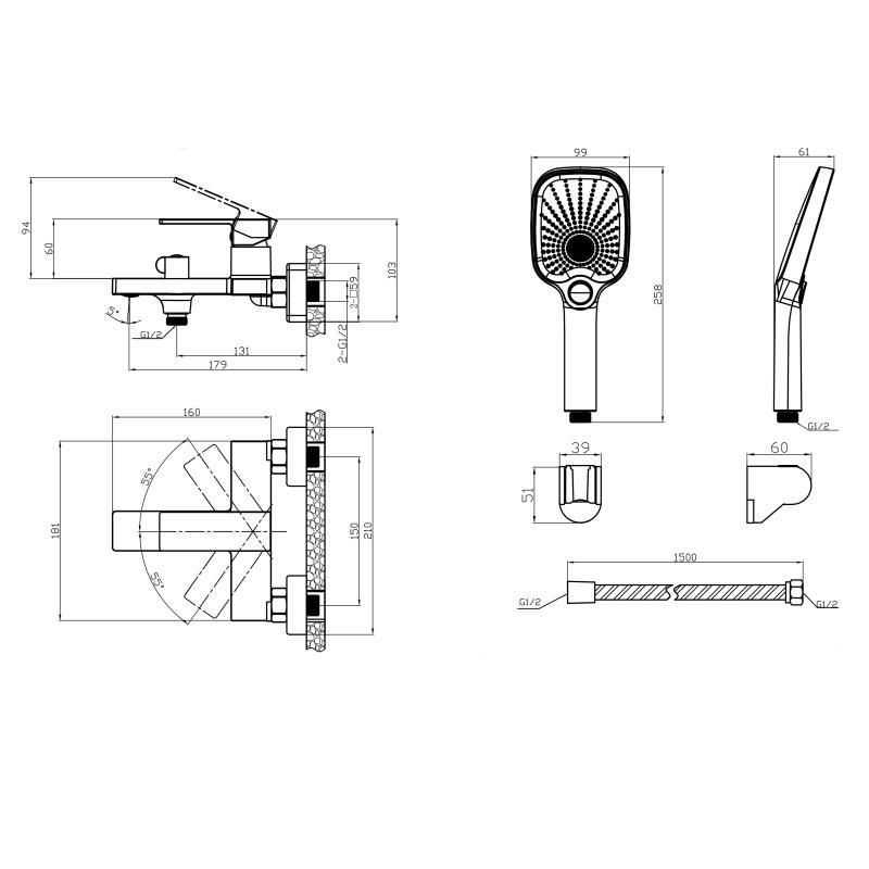 Смеситель для ванны Qtap Gemini с душевым гарнитуром QTGEM259GMB45684 Gunmetal Black PVD