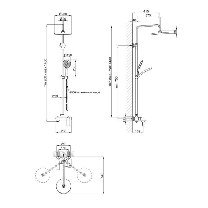 Высота душевой стойки, мм840-1430