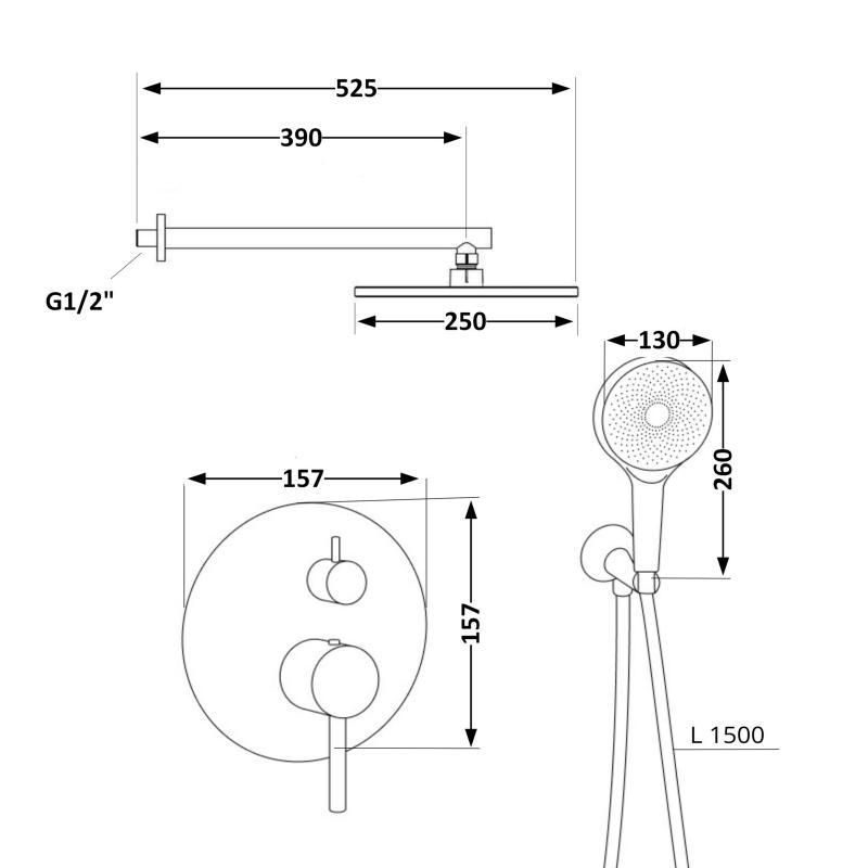 Габаритные размеры изделия (ШхГхВ), ммЛейка верхнего душа: 255х255х50; ручна лейка: 132х50х260; смеситель: 160х35х170