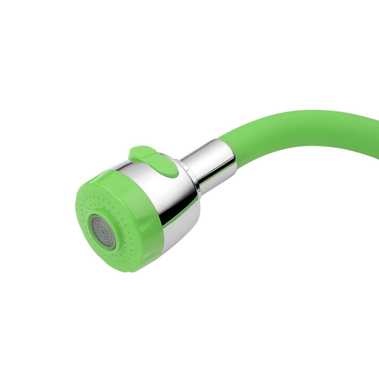 Особенно удобен гибкий излив, который обеспечивает свободу маневров и позволяет направлять воду в нужное место, что упрощает мытье крупных кухонных предметов. Смеситель также оснащен аэратором с двумя режимами подачи воды — душевой и струей, что позволяет выбрать оптимальный вариант для различных нужд.