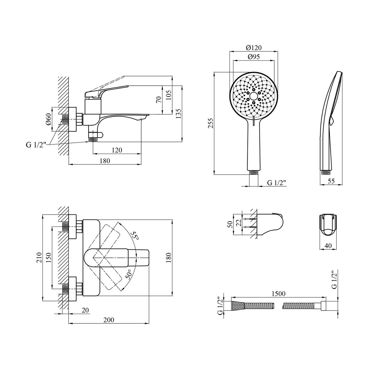 КомплектацияСмеситель, лейка для ручного душа, душевой шланг, кронштейн для ручного душа, крепежи, инструкция.