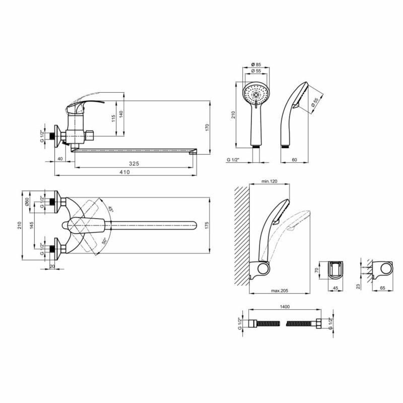 Дополнительные характеристикиГабариты лейки для ручного душа: 210х85х60. Длина душевого шланга - 1400 мм.