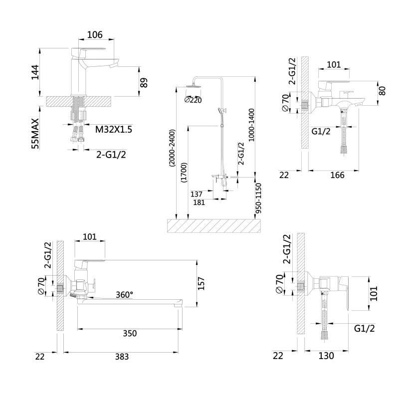 Вес брутто, кг0,97 - для раковины; 1,505 - для ванны; 1,7 - для ванны с поворотным изливом; 1,2 - для душа; 4,7 - душевая система