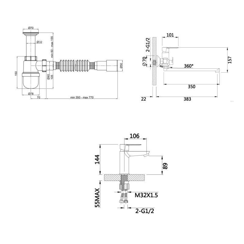 КомплектацияСмеситель для раковины (LDLAT001WHI45423), смеситель для ванны (LDLAT010WHI45426), сифон (LU01)
