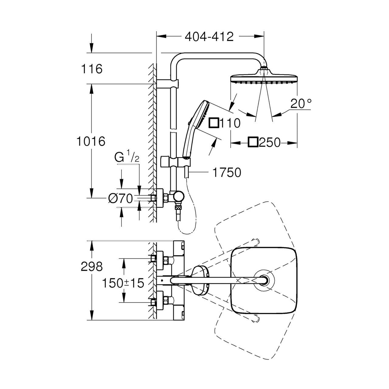 Диаметр ручной лейки, мм110х110