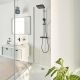 Ручной душ Vitalio Comfort 110: Имеет два режима струя - Rain и Jet, с ограничителем расхода воды GROHE Water Saving на уровне 5,7 л/мин. Регулируется по высоте с помощью скользящего элемента для удобства использования.