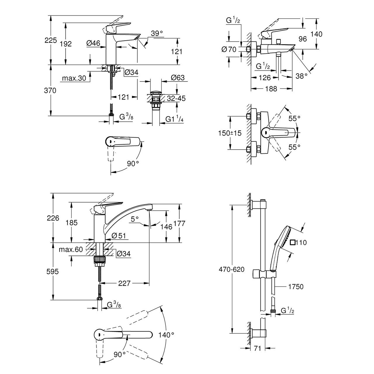 Набор смесителей 4 в 1 для ванной комнаты и кухни Grohe QuickFix Start M-Size UA202301KE