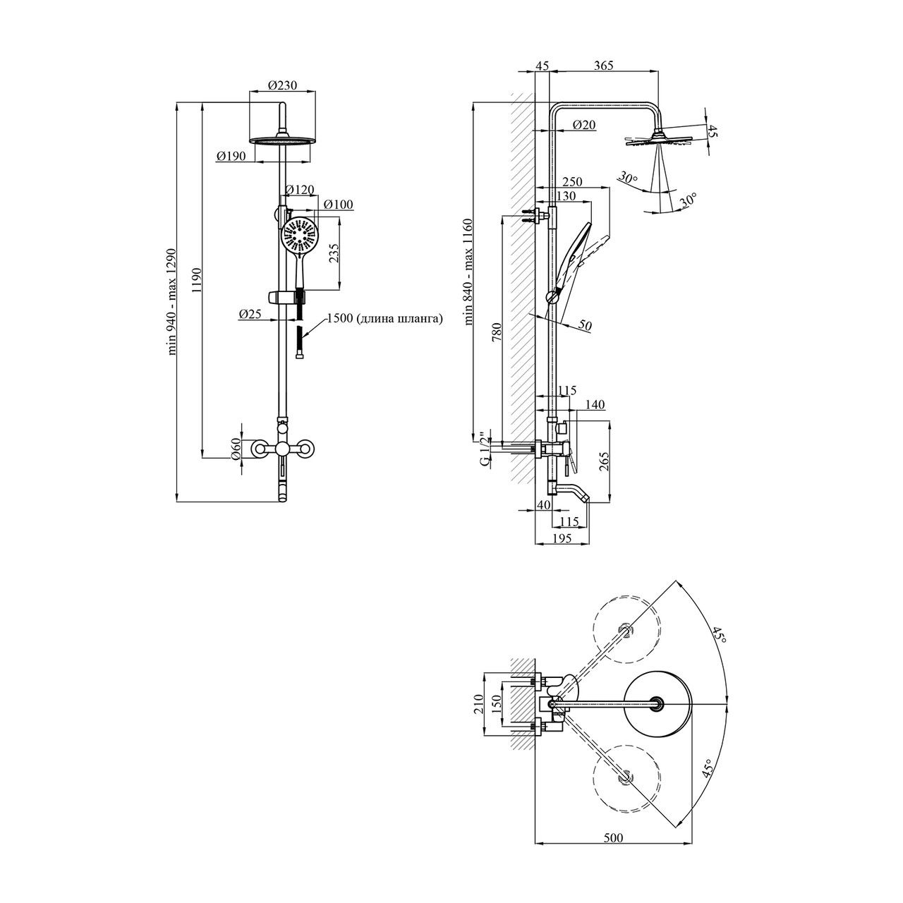 Набор 3 в 1 душевая система Kroner Edelstahl Klassisch-SCH063 + смеситель Edelstahl Klassisch-SCH010 +