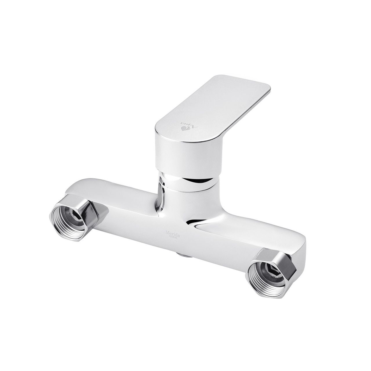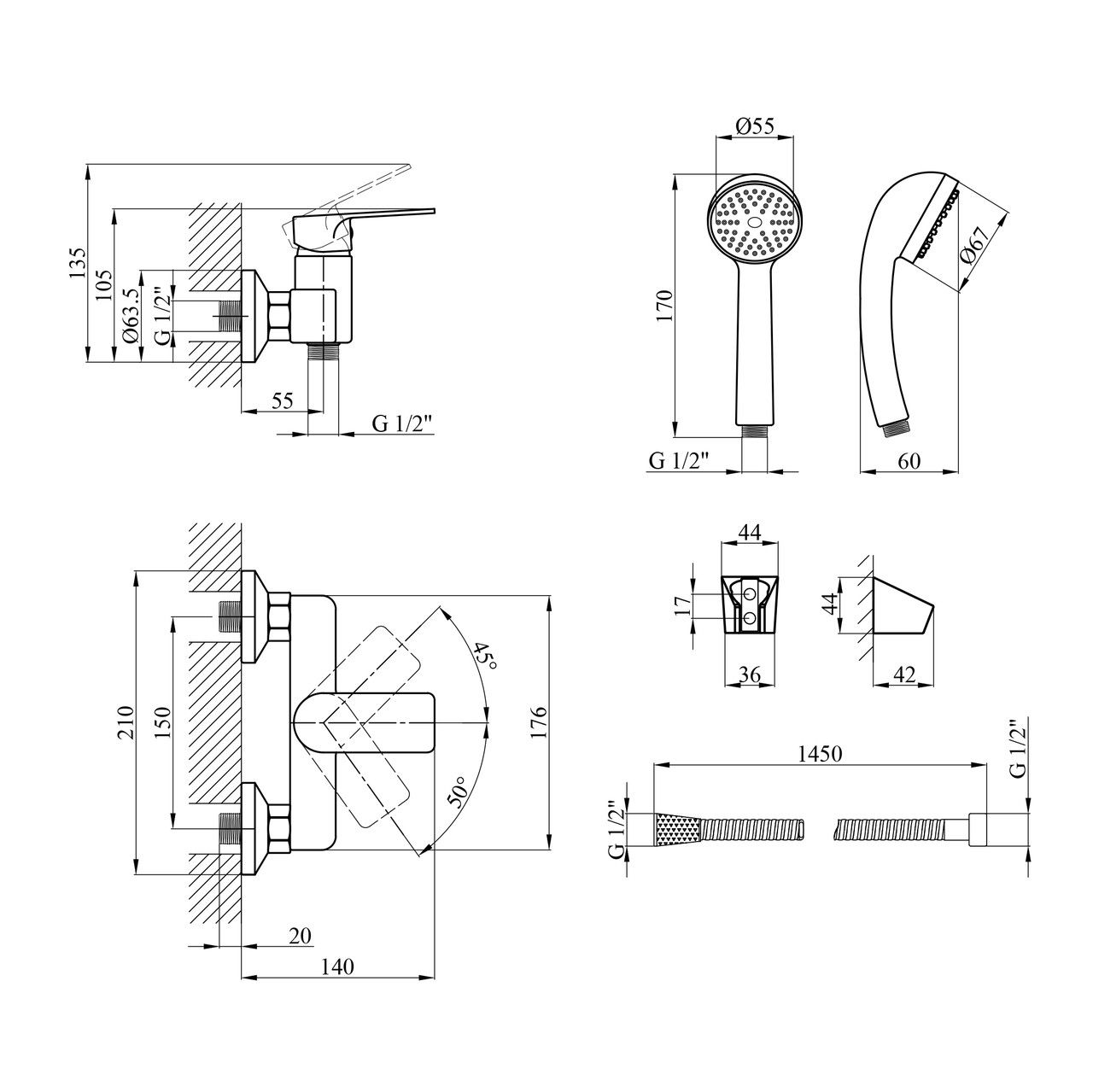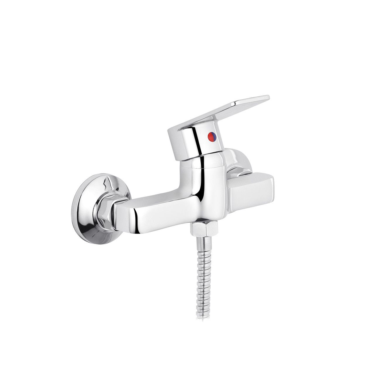 Модель комплектуется всем необходимым для комфортного принятия душа: круглой лейкой с одним режимом струи, гибким шлангом длиной 1450 мм и кронштейном для фиксации ручного душа. Настенный монтаж на эксцентриках обеспечивает лёгкую установку и устойчивость конструкции. Смеситель рассчитан на работу при давлении до 3 бар и расходе воды до 13 литров в минуту, что делает его экономичным и практичным в повседневном использовании.