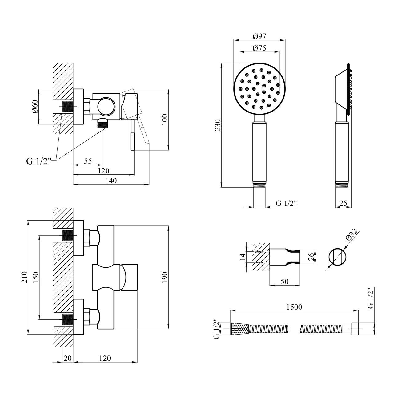 КомплектацияСмеситель, лейка для ручного душа, душевой шланг, кронштейн для ручного душа, крепежи, инструкция.